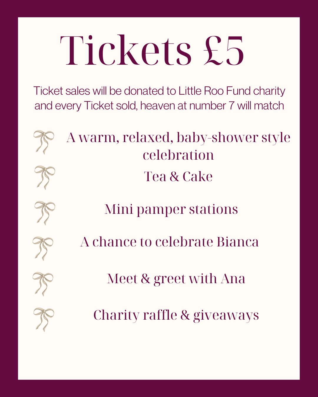 A £5 ticket to Bianca's Baby Shower Event - all ticket sales donated to Little Roo charity, and Heaven at number 7 will match every ticket sold as a donation.